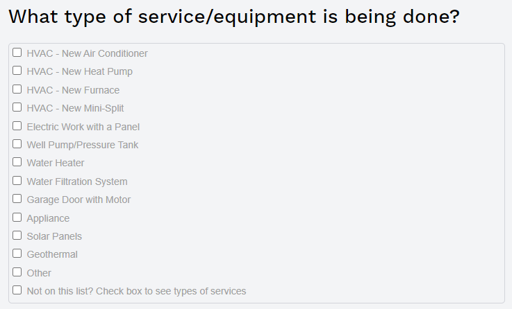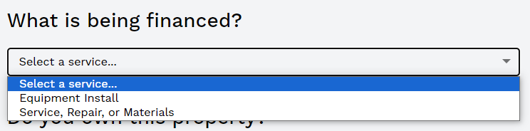 Guidance: We need to know if they're financing equipment or not. We call this "service", and you can get the options from the Get Services endpoint. The endpoint returns labels and a corresponding key. Display these options in a dropdown menu.