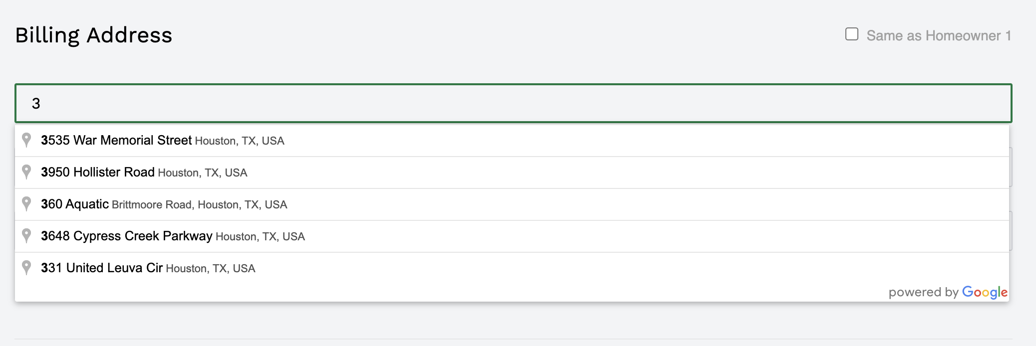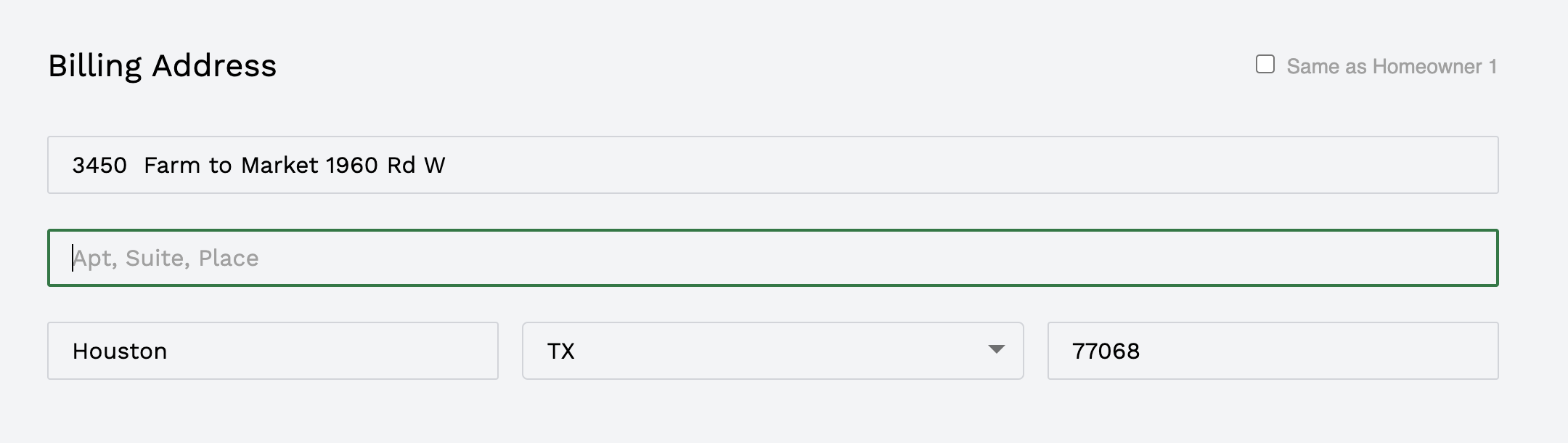 Guidance: The homeowner's billing address is a required object field. Street Address, Street Address 2, city, state and zip are all strings. The state needs to be an acronym, (e.g: TX for Texas, MO for Missouri ), the zip code is only 5 digits long.