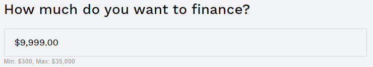 Guidance: Provide an input in the format of a dollar amount, enabling users to key in a figure with up to 2 decimal places. Validate the entered amount against the min/max limits of the selected service, displaying errors if the amount is out of range. For user clarity, indicate the permissible range, e.g., "Min: $300, Max: $35,000".